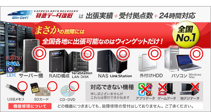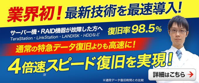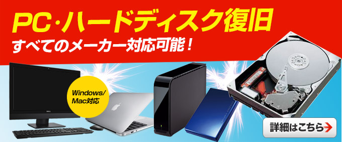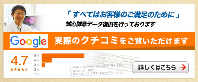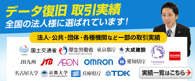 | お客様の声 | 各人の業務や企画関連のデータが入っていたため、復旧して頂いてとても助かりました。 特急で対応して頂けて大変良かったです。 | ||
