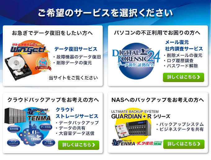 | お客様の声 | 各人の業務や企画関連のデータが入っていたため、復旧して頂いてとても助かりました。 特急で対応して頂けて大変良かったです。 | ||