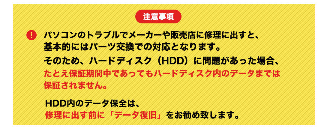 中には仕事で使用する大切なデータが入っている。緊急で必要というわけではないけれど、のちのち必ず必要になるデータです。時間はかかってもよいのでなんとかデータ復旧してほしいです。
