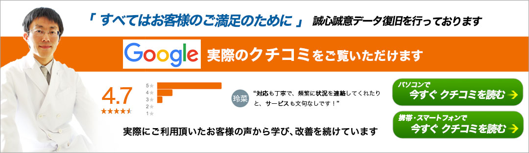 結果として、ハードディスクの記録面が損傷していたため、完全な復旧とはなりませんでしたが、ご要望のデータの取得に成功したため、お客様には満足して頂けました。