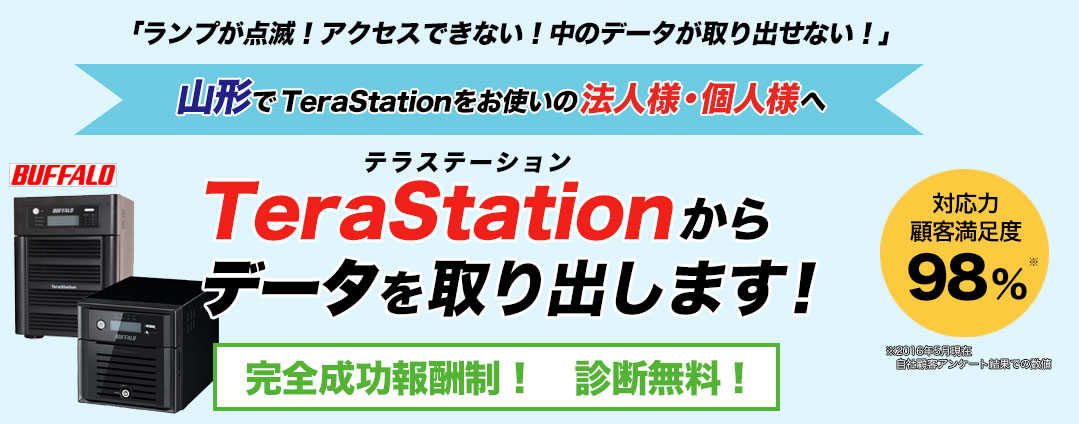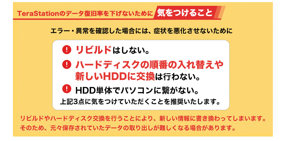そのため、「必要なデータがTeraStation内に残ったまま」「バックアップが取れていない」等の場合は、データ復旧を行ってから修理を依頼されることをお勧めします。