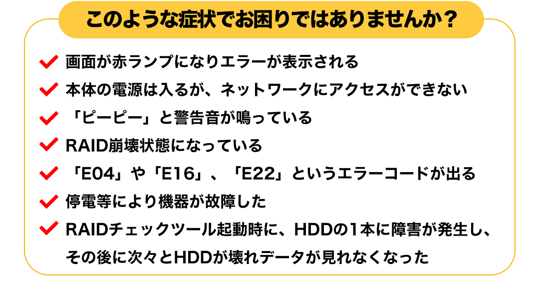 データ復旧とは、TeraStationがエラーが表示される・「ピーピー」と警告音が鳴っている・RAID崩壊状態になっている などの故障してしまった状態から、ハードディスク内に保存されていたデータを取り出し、新しい別のハードディスクにデータを納品してお渡しするサービスのことを言います。